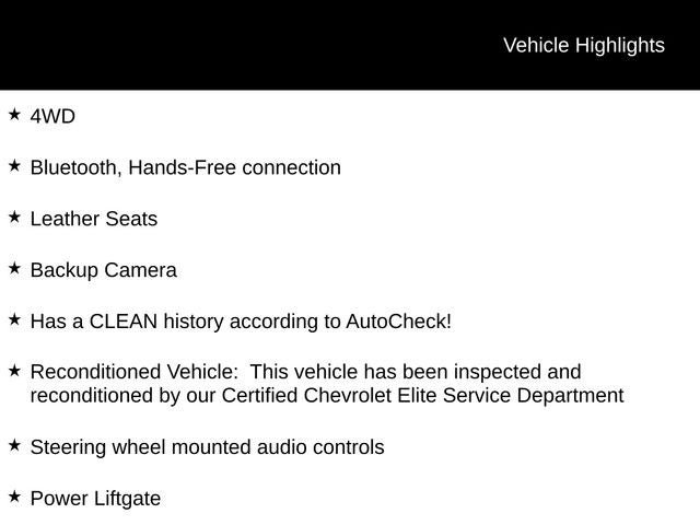 - Reconditioned Vehicle: This vehicle has been inspected and reconditioned by our Certified Chevrolet Elite Service Department