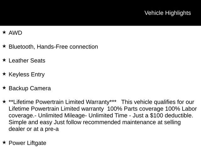 - **Lifetime Powertrain Limited Warranty*** This vehicle qualifies for our Lifetime Powertrain Limited warranty 100% Parts coverage 100% Labor coverage.- Unlimited Mileage- Unlimited Time - Just a $100 deductible. Simple and easy Just follow recommended maintenance at selling dealer or at a pre-a