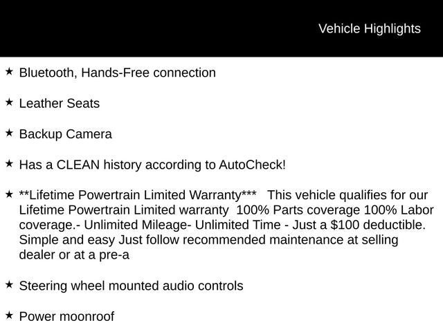 Ensuring your complete peace of mind, this vehicle boasts a clean history according to AutoCheck, and it comes with a Lifetime Powertrain Limited Warranty that provides 100% parts and labor coverage, with no mileage or time restrictions. Simply follow the recommended maintenance schedule at our dealership or any pre-approved service center, and you can enjoy the confidence of knowing your investment is protected.