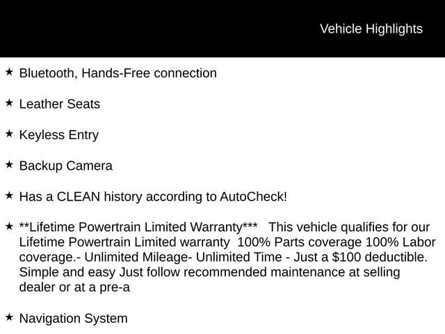 - **Lifetime Powertrain Limited Warranty*** This vehicle qualifies for our Lifetime Powertrain Limited warranty 100% Parts coverage 100% Labor coverage.- Unlimited Mileage- Unlimited Time - Just a $100 deductible. Simple and easy Just follow recommended maintenance at selling dealer or at a pre-a