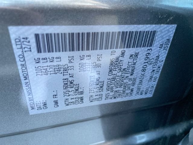 **We Deliver from our floor to your door! It's that easy! If you live within one hundred miles of our dealership, we will also deliver your car. See Dealer for delivery details. Buy Online-Get Trade Value Online-Email-Chat-Phone-Text and we will Deliver your Pre-owned vehicle to your door.** 4-Wheel Disc Brakes, 6 Speakers, ABS brakes, Air Conditioning, Alloy wheels, AM/FM radio: SiriusXM, Android Auto and Apple CarPlay, Auto High-beam Headlights, Automatic temperature control, Brake assist, Bumpers: body-color, Cloth Seat Trim with Patterned Inserts, Delay-off headlights, Driver door bin, Driver vanity mirror, Dual front impact airbags, Dual front side impact airbags, Electronic Stability Control, Emergency communication system: NissanConnect Services, First Aid Kit, Floor Mats with 1-Piece Cargo Area Protector, Four wheel independent suspension, Front anti-roll bar, Front Bucket Seats, Front Bucket Seats with 8-Way Power Driver Seat, Front Center Armrest, Front dual zone A/C, Front reading lights, Fully automatic headlights, Heated door mirrors, Illuminated entry, Knee airbag, Low tire pressure warning, Occupant sensing airbag, Outside temperature display, Overhead airbag, Overhead console, Panic alarm, Passenger door bin, Passenger vanity mirror, Power door mirrors, Power driver seat, Power Liftgate, Power steering, Power windows, Radio data system, Radio: NissanConnect with 6 Speakers, Rear anti-roll bar, Rear seat center armrest, Rear side impact airbag, Rear window defroster, Rear window wiper, Remote keyless entry, Speed control, Speed-sensing steering, Speed-Sensitive Wipers, Split folding rear seat, Spoiler, Steering wheel mounted audio controls, Tachometer, Telescoping steering wheel, Tilt steering wheel, Traction control, Trip computer, Variably intermittent wipers, and Wheels: 18 Dark Painted Machine Finished Alloy.